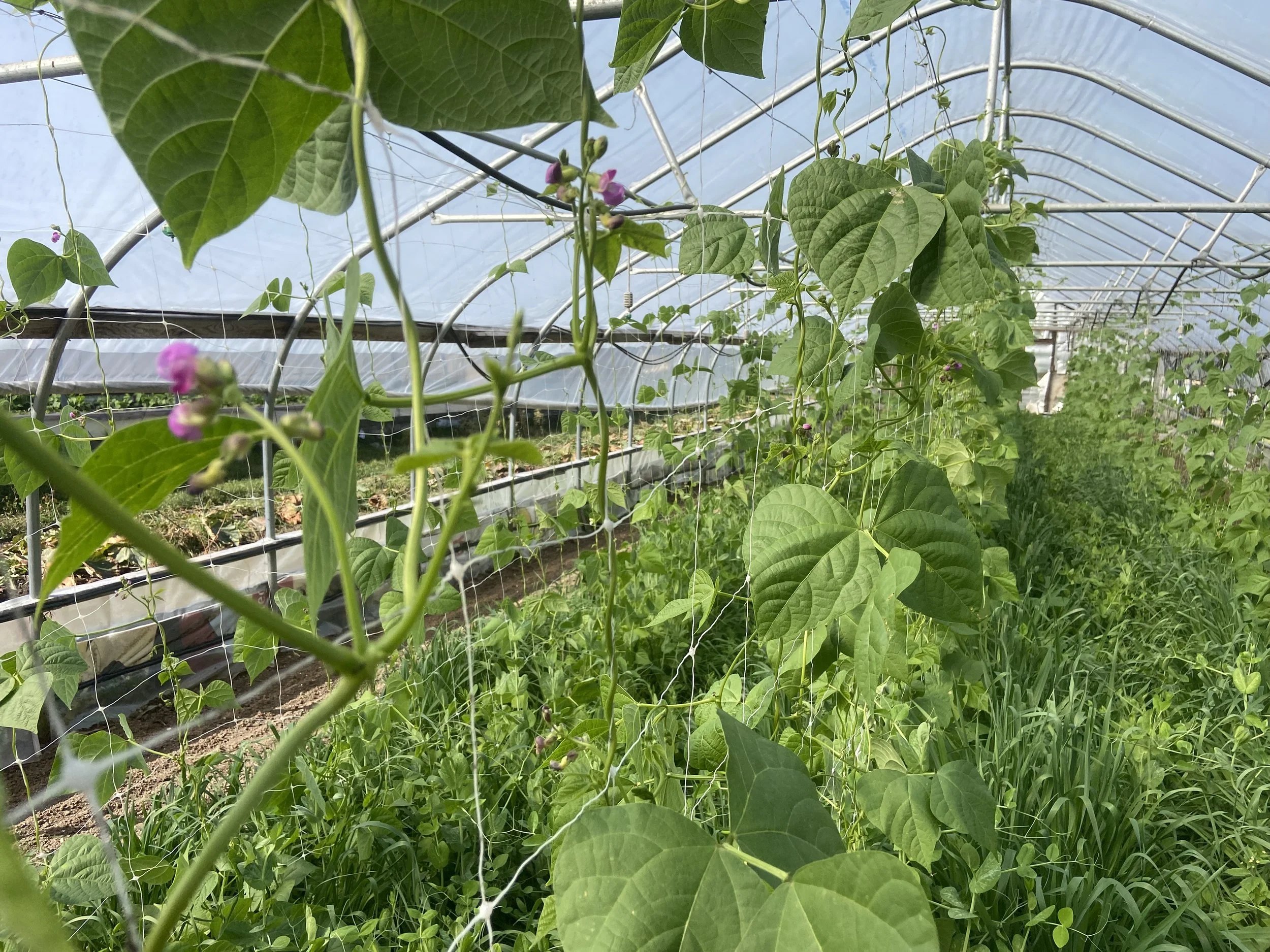 Pole Beans in Greenhouse 3 may come to fruition….we are hoping! The cover crop of oats and peas are doing well and will set up next seasons cash crop.