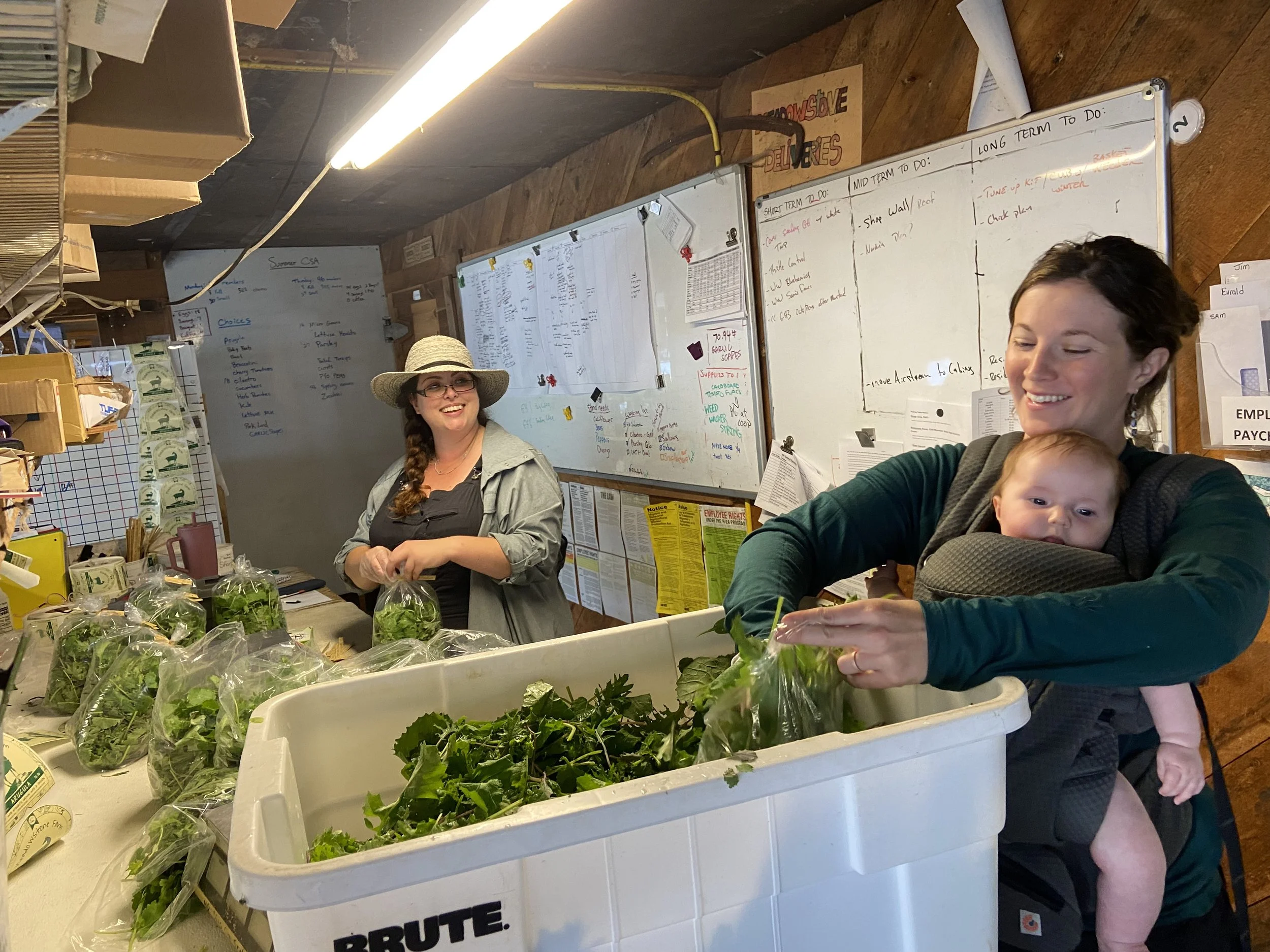 Jess, Mikaela, and Addison spent a busy Thursday packing up greens, for the farm stand, Littleton Food Coop, and CSA.