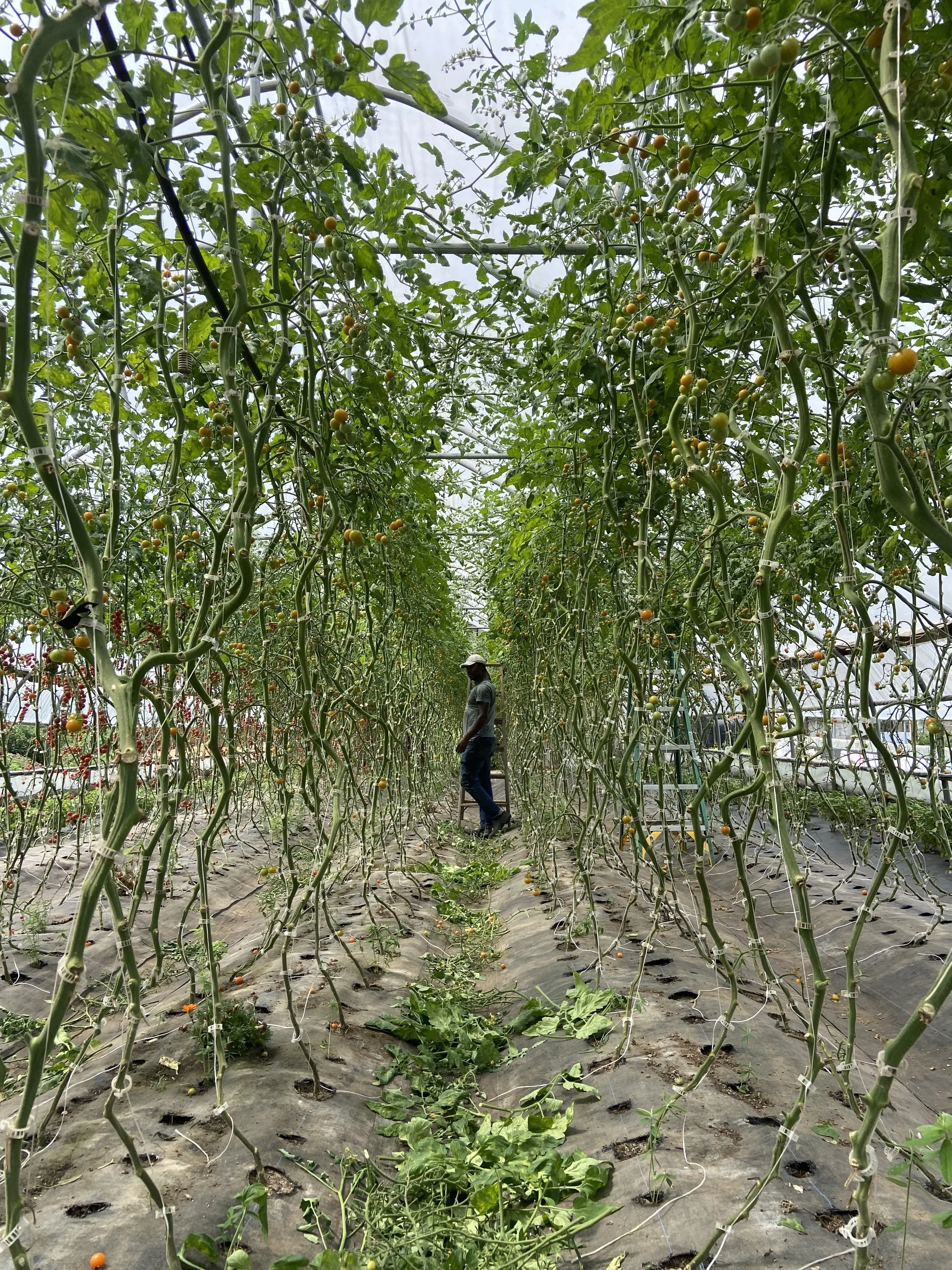 Evrald needed the ladder to prune and trellis GH4 cherry tomatoes. We are harvesting sometimes up to 130 pints in a single day as we also have cherry tomatoes of different ages in 3 other greenhouses as well.