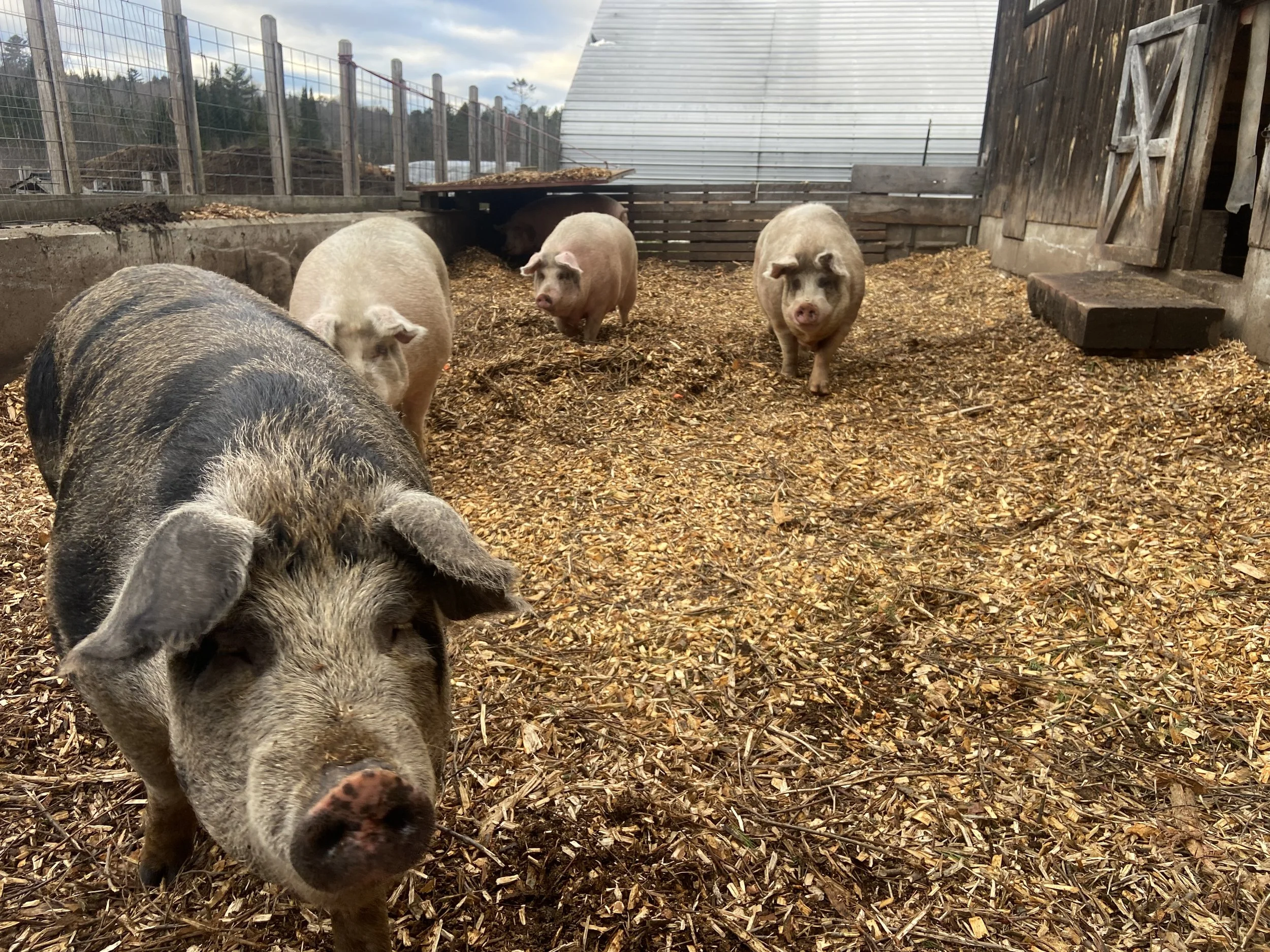 Our boar Buttons and our sows, Penny, Patty, Myrtle, Altouise, and Astrid primarily live in the old goat barn. We do separate the sows to their own pen when they are about to farrow (give birth). The gestation period for a pig is 3 months, 3 weeks, and 3 days, or about 114 days. We hope to have some piglets running around the farm in the next few weeks!